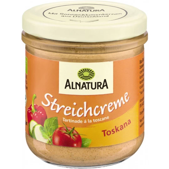 Eine vegane Bio-Streichcreme auf Basis aromatischer, fein vermahlener Sonnenblumenkerne. Rote Paprika, Auberginen und Zucchini sowie Tomatenmark und Kräuter sorgen für die mediterrane Note. Die Alnatura Streichcreme Toskana schmeckt nicht nur auf dem Brot, sondern auch als Dip oder Saucengrundlage.