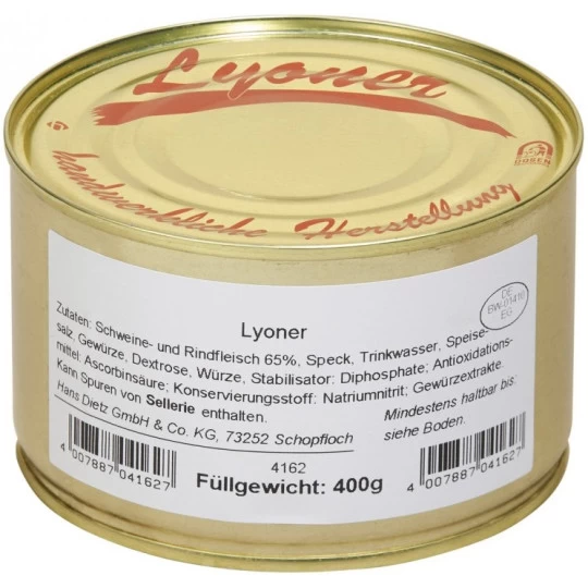 Zutatenverzeichnis: Schweine- und Rindfleisch 65%, Speck, Trinkwasser, Speisesalz, Gewürze, Dextrose, Würze, Stabilisator: Diphosphate; Antioxidationsmittel: Ascorbinsäure; Konservierungsstoff: Natriumnitrit; Gewürzextrakte.